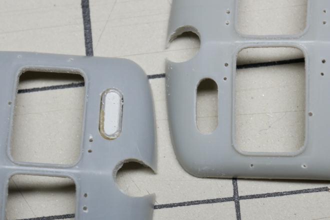 悩んだ結果、運行番号表示窓はそのまま開口するだけにした。はめ込むパーツにちょっとした工夫はしてみるつもり。パーツは例によっておゆまると光硬化パテを利用したコピー品を用意する予定で、ここに写っているもの(左側)は前回の残り(予備)である(だから既に色が塗られている)。