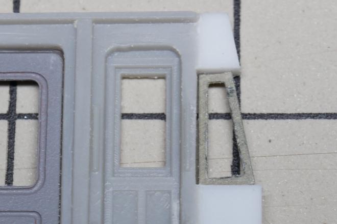 三角窓が窓枠パーツに対して幅が大きくなってしまった(天地方向は小さめだったので、削って調整した)。付け足したプラ板を削って窓枠に合わせるか、それとも出来る隙間を埋めるかで少し悩んだのだが、寸法的には後者が正解のような気がしたのでそっちを選んだ。 |