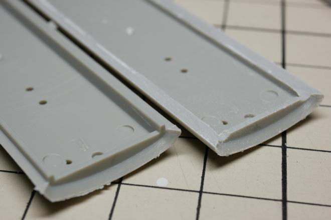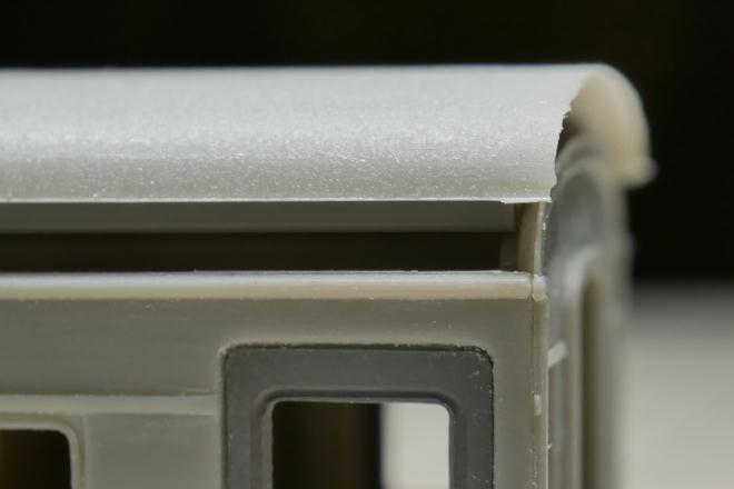 屋根パーツの裏側には、取り付けのガイドとなるリブが付いている(左側)。高さを調整するのにリブの外側をチマチマ削ったこともあるのだが、手間が掛かってしょうがないのでリブも落として全体をガリガリ削った(右)。 |