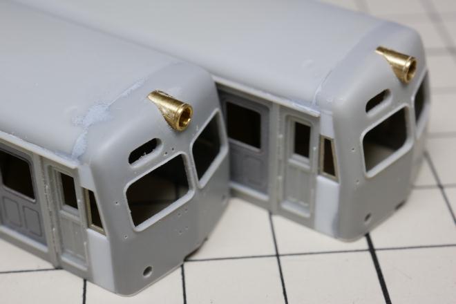 上記作業の途中写真で、とりあえず接着したところまで。この後一旦やすり掛けで全体を馴染ませてからパテ埋めをして、再度均している。クハ76前面〜クハ76屋根の部分はサイズがぴったりなので、作業後の写真では一見して一体パーツのようになっている。