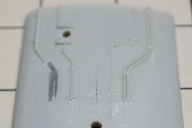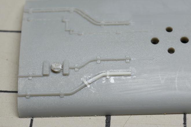 母線の直しはプラモールドの配管に付け足す形になるので、φ0.4mmのプラ棒を使った。0.05mmプラペーパーを使って配管止めや台座っぽいものも表現。写真で見るとぐちゃぐちゃだが、完成すればそれなりに見れるようになる……予定(願望)だ。