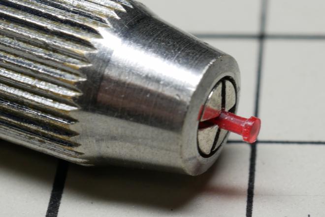 テールライトは銀河モデルのパーツ(N-021)を使っているが、この製品、ロットによってはライトレンズが奥まで綺麗にハマらない。金型で成形しているならばこんなこと起きないと思うのだが、もしかすると削り出しで作ってる?(確かにライト表面はヤスったかのようにざらざらしている) というわけで、奥まで入るように根元のところを少し削って細くしておく。極小パーツ故に手で保持していると飛んでいきそうなので、ピンバイスに咥えさせて作業。 |