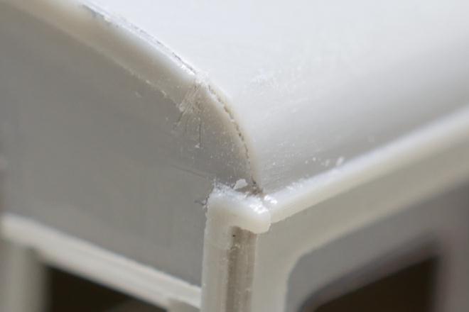 基本番台の80系は製造時、屋根キャンバスが一部分だけに張られていた。妻面のキャンバス押さえも途中までなので、少し削る。見えにくいところなのでサボッても完成度にはほぼ影響しない。完全に自己満足だ。その一方で、クハの屋根上先頭部にあるはずのキャンバス押さえは再現していない。実にちぐはぐである。 |