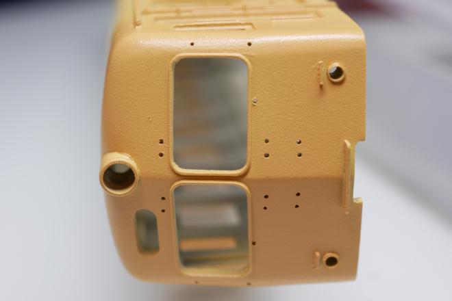 ちょっとした時間の隙間が出来たので、先に妻面窓用のマスキングを済ませておいた。かなり不均一だが、どうせ妻面で目立たないのと、2枚以上連続で隣り合うことがないのでこれぐらいで大丈夫。 |