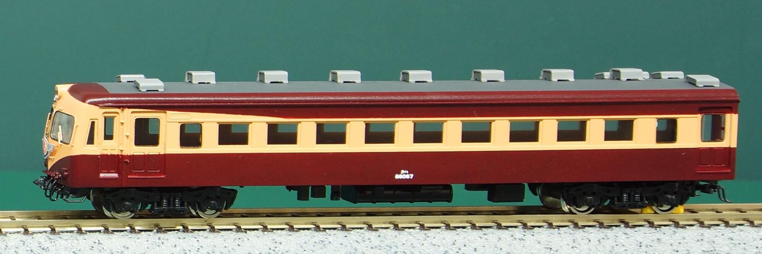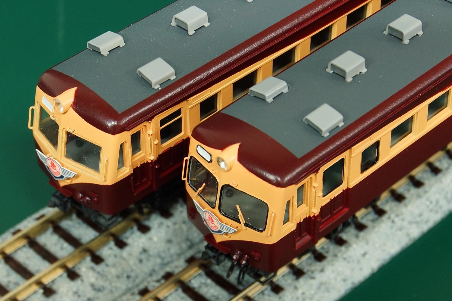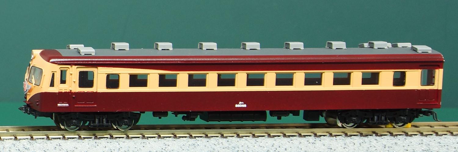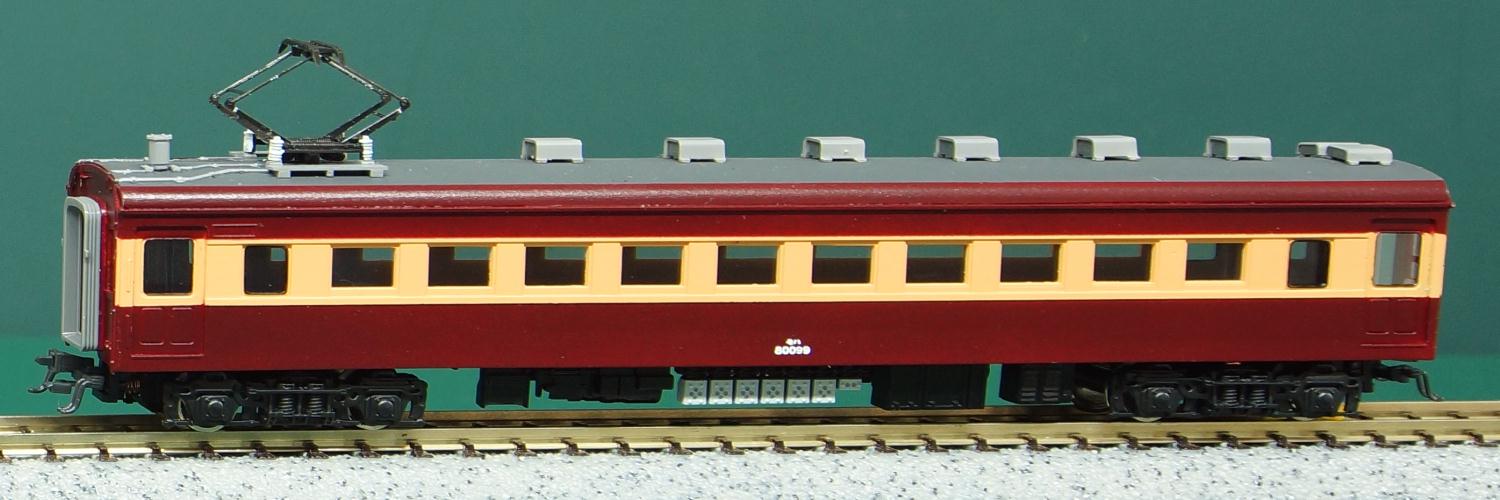 ディティールで異なる部分以外は1951年編成と同じ作りなのだが、唯一変えたところはクハの運転室上の屋根の塗り分けラインである。実物ではキャンバスが張ってあるグレーの部分を少し後退させた。ほんの2〜3ミリではあるが、かなり印象が変わって来る。多分今回の方が正解だと思うのだが、正確な資料も少なく推測が混じる。同形状の70系と80系でも違うし、同じ80系でも製造時期によって違うし、さらには更新修繕工事で変わっている可能性もありではっきりしない。幸い私はキャンバス押さえを省略しているので、もし後から正確な資料が見つかった場合でも修正が可能である。 |