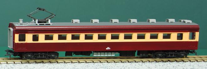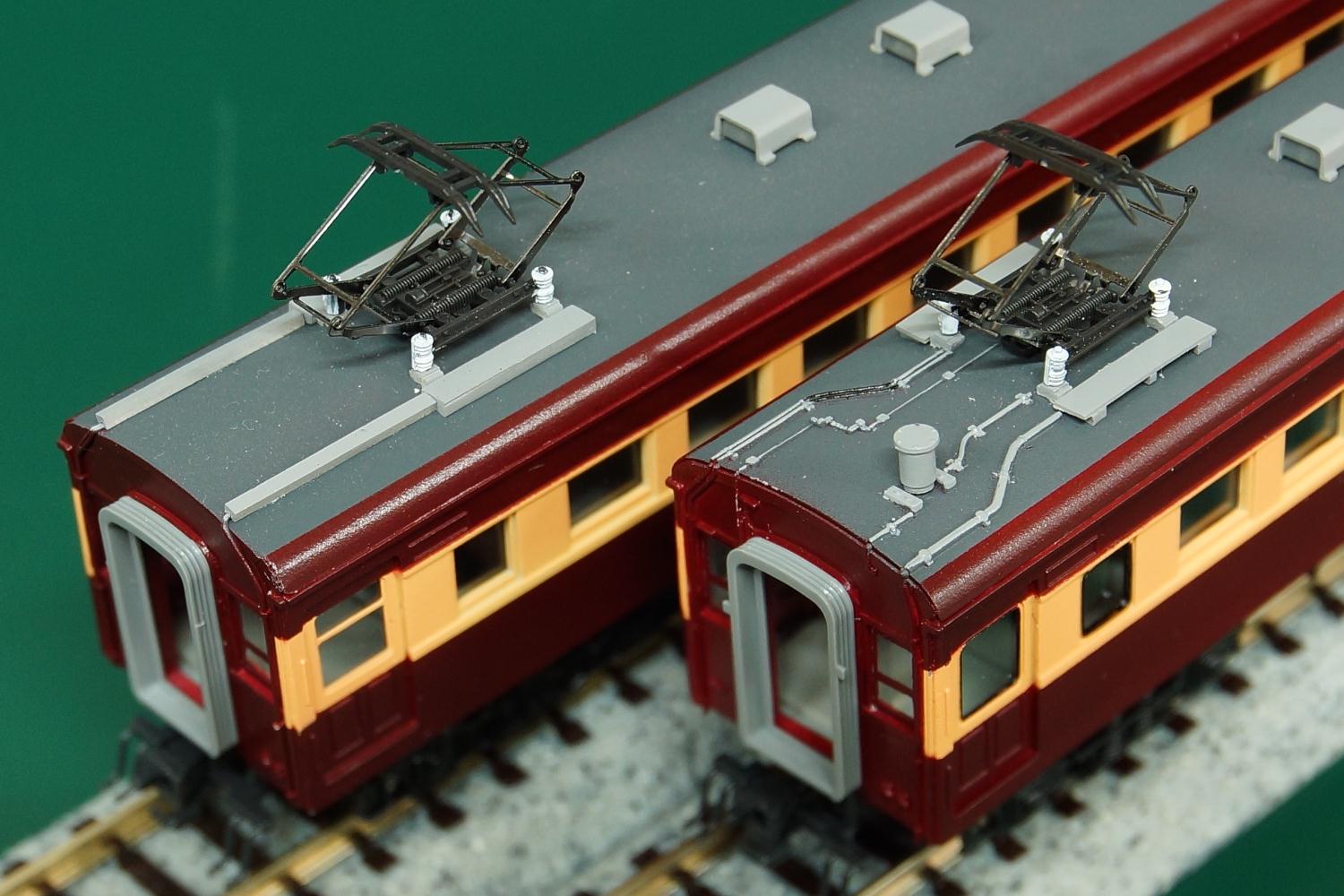 パンタグラフ周りは1951年編成と同じにするつもりで作り始めたが、実車資料を見ていると他形式では1952〜1953年頃から屋根上に避雷器が確認できる。その頃に更新工事か何かで取り付けられるようになったのか? だとすればその後に製造された車両は最初から屋根上避雷器だったのではないか? というわけで今回はキットのモールドをそのまま利用している。 |
