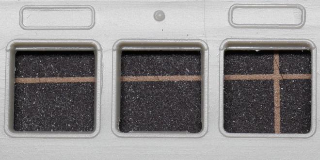 いつもの「窓の抜き勾配削り」からスタート。毎度同じような写真だが、毎回写真は撮っている……今回のは分かりにくい写真になってしまった(苦笑) 左がキットの状態そのまま、真ん中が窓の左右下部を丸ヤスリで削ったところ、右が全体を削り終えたところである。 |