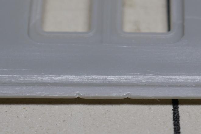 今回2箱開けたが、1つは最近生産されたものだがもう1つが古いロットになる。古いロットでは同じ先頭車側板の上部に変な凹みがあるので、こちらも修正しておく(写真は手付かずの状態で、この後パテ埋めすることになる)。