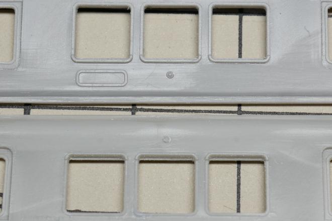 先週に引き続き“下ごしらえ”とでもいうべき作業が続く。GMエコノミーの阪急キットお約束で、不要な方向幕や側灯を削る。写真をビフォーアフター形式にするのを忘れていた(全部終わってから写真撮った)。他、金型の傷に起因すると思われる部分もやすり掛けで修正しておいた。 |