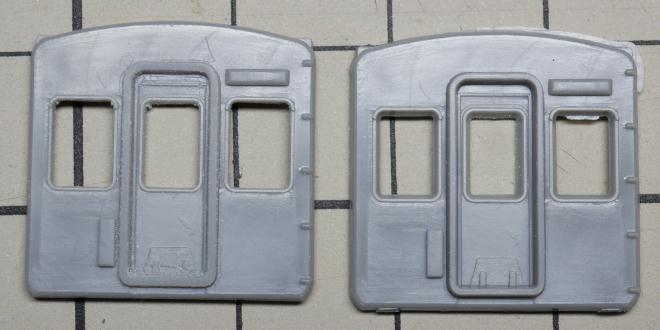 妻面パーツも、窓の抜き勾配を削り(側面に比べて効果は大きいと思うが、側面だけに目立たないかも)、別の幌パーツを付けるので幌枠を薄く削っておく。こちらの写真は左が作業後で右がキットそのままだ。右のパーツ、最近のロットか旧ロットか分からなくなってしまったが、バリがちょっと酷い。