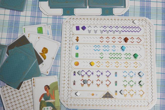 『グレートスプリット』のプレイヤーボード 基本はカードゲームで、ボードはスコアの記録用だ