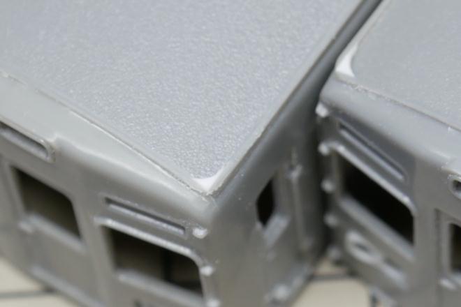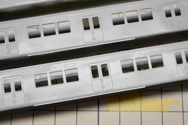 引き続き「いつもの」が続く。キットでは良く分からない表現になっている先頭部の雨樋の角の部分を加工する。と言っても、実車が結構複雑な造形?をしていて完全再現は難しい。適当にプラ板を貼り付けて丸く削って「何かそれっぽく」しているだけだ。ちなみにだが、グリーンマックスの完成品も「こんな感じ」である。 |