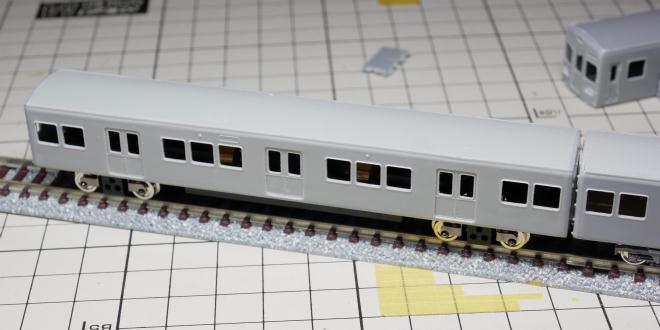先週書いたように、動力ユニットは中間の(実車における)T車に組み込むことにした。中間車のうちの1両に、鉄道コレクション用動力ユニットがワンタッチで組み込めるような爪を付けた(右の車両は、高さや水平チェック用に床板と台車を合わせたもの)。 |