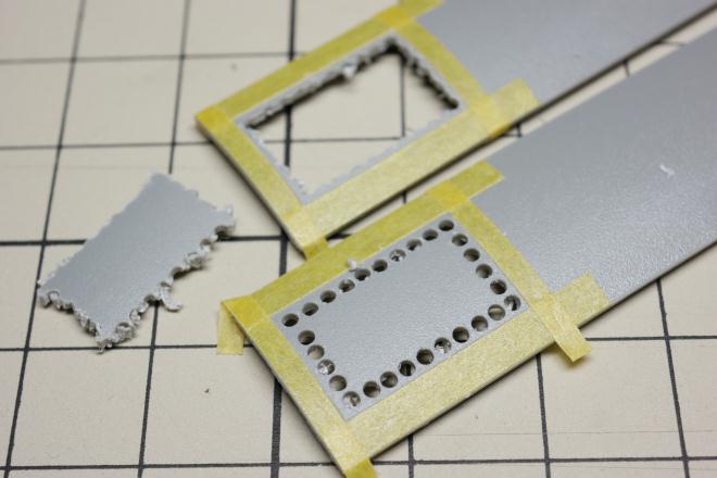 いきなりカッターナイフの刃を入れると、外周部に負担がかかって歪んだり破損に繋がる恐れがある。そこで先に中央部をくり抜いておく。まずは写真手前のように、ドリルでぐるりと一周穴を開け、ニッパーでざっくり切り落とす(写真奥)。この後テープに沿ってカッターでじっくりなぞっていき、残った部分を四辺個別に切り落とす。 |