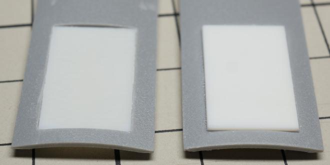 開口部を綺麗に整え、寸法を調整した後でプラ板をはめ込む。ここでも一度に厚みのあるプラ板を接着するのではなく、二段階で作業する。まず1枚目は開口部の左右に渡すように接着する(写真左)。開口部に左右のズレがないことが前提になるが、こうすることで水平が出しやすい。その後に2枚目を載せて完了だ(写真右)。2枚目のプラ板は、断面が台形になるよう両側を少し斜めに削っている。 |