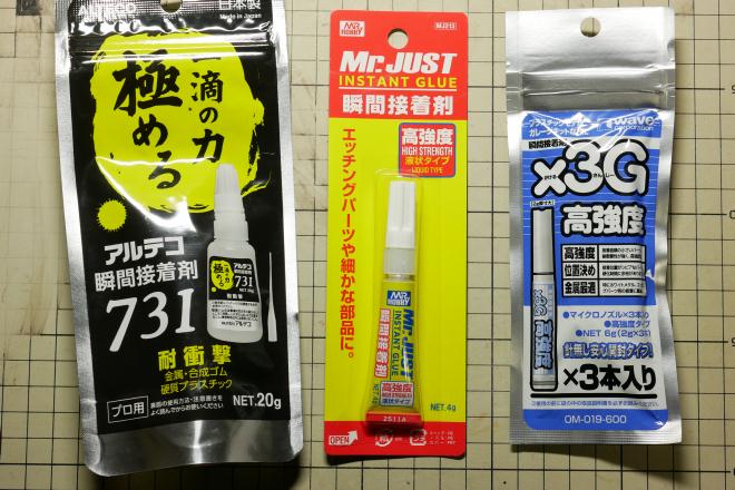 外れてしまった真鍮線を再度接着すべく、3種類の瞬間接着剤を買ってみた。いずれも強力であることを謳い文句にしている製品だ。一番右のウェーブ製品は過去に何度か使っており、“実績”という意味ではこれが一番なのだが、他のも使ってみないことには分からない。 |