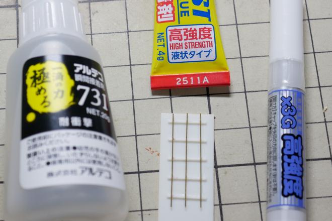 プラ板で簡単な試験モデルを作って、真鍮線を固定してみた。固着までの時間が一番短かったのは中央のクレオス製品。固まった後ピンセットで引っ張ってみたのだが、強度的にはどれもこれも似たり寄ったり。真鍮線とプラスチックの接着なので、完璧な強度が得られないのは仕方がない。完成後は丁寧に気を付けて取り扱うしかない。 |