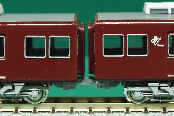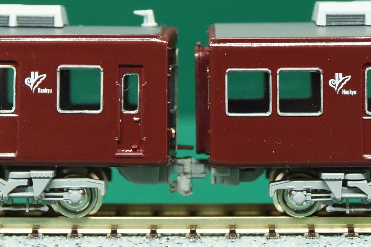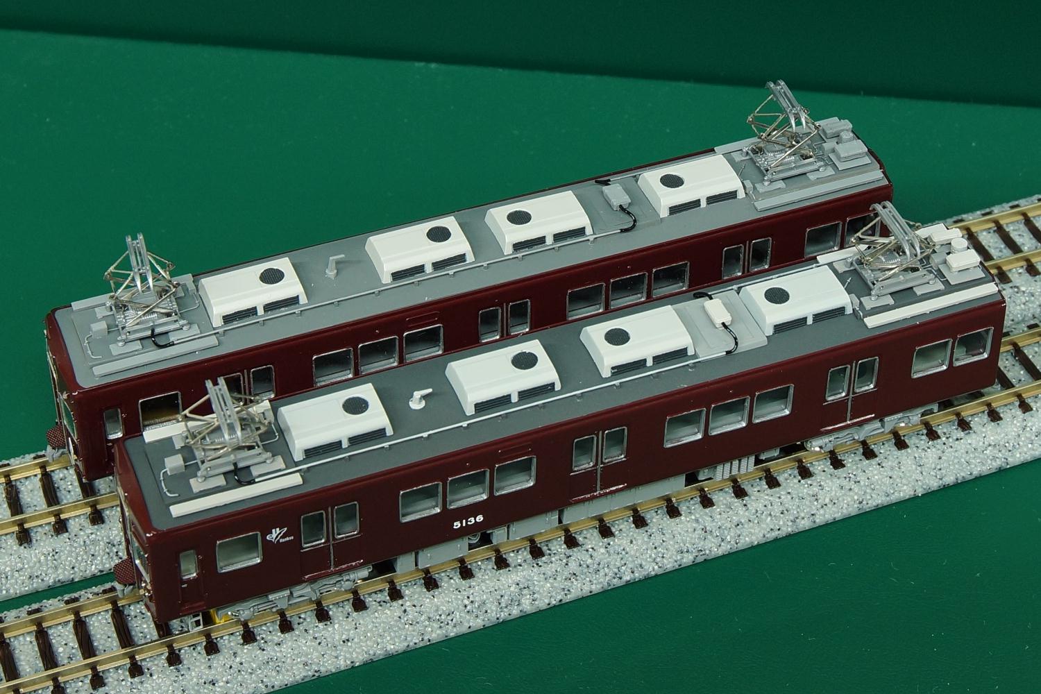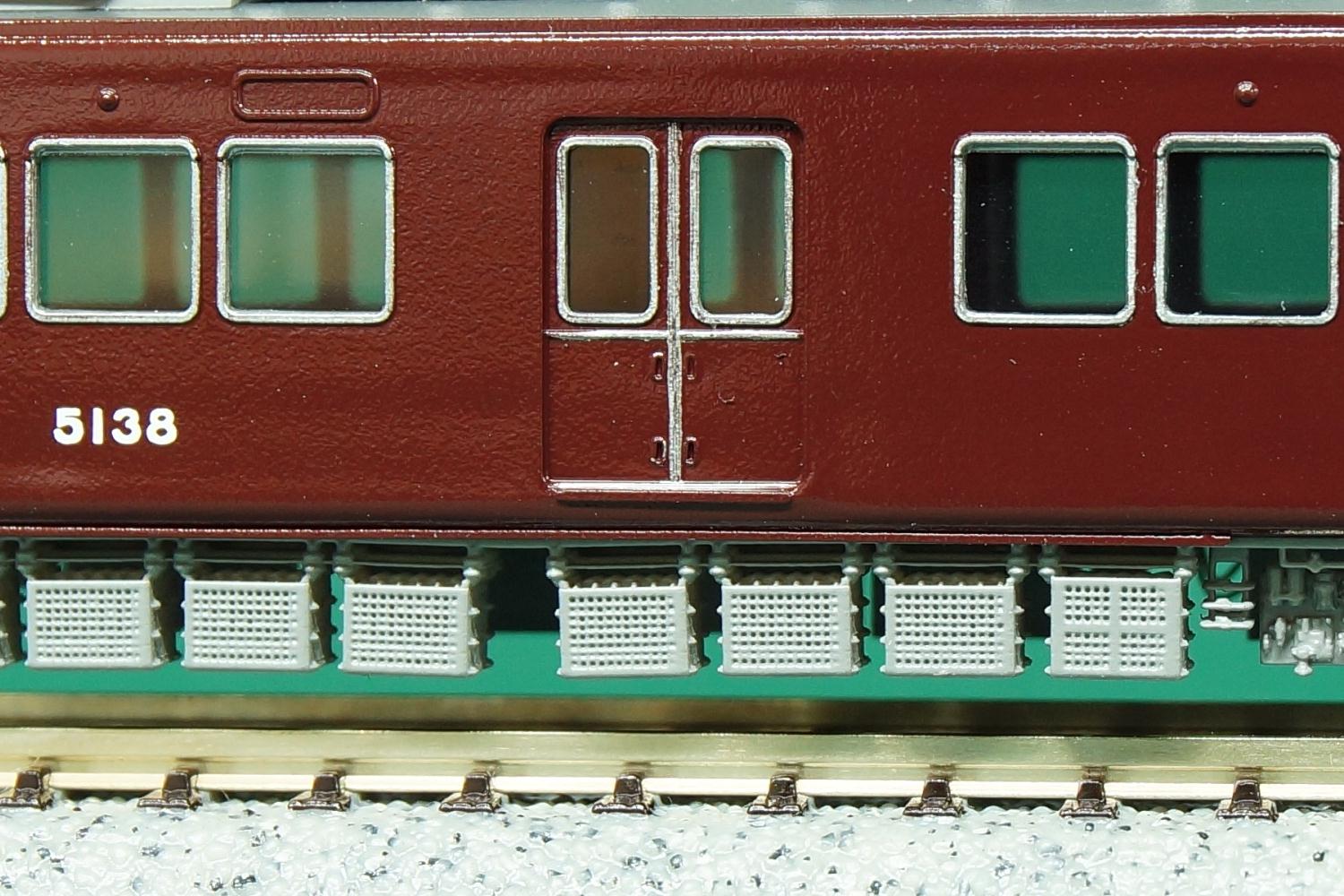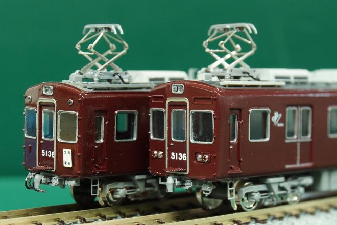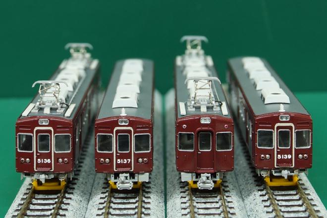 運転台の付いた車両4両の様子。編成両端はこれまたいつも通りで代わり映えがしないが、中間の2両はそれぞれ箕面線代走、2連増結での遊び方も考慮してTNカプラーを取り付けてある。電連はサードパーティーの3Dプリント品である(袋から出して色を塗った状態でストックしてあったため、メーカー名は失念)。5138の前面ナンバーは、編成先頭に出ることがないため省略した。