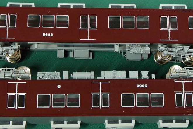 写真上が今回のもの、下が原形の「5688」の床下なのだが、機器の密度が大きく異なってしまった。原形に取り付けたパーツの方が正しいようで、これが5132F用の床下機器を使った“弊害”である。抵抗器カバーの形状ばかりに目が行き、全体が俯瞰できていなかった。「木を見て森を見ず」の典型だ。改めて該当形状を含む別のセットを追加注文するかどうか思案中である。 |