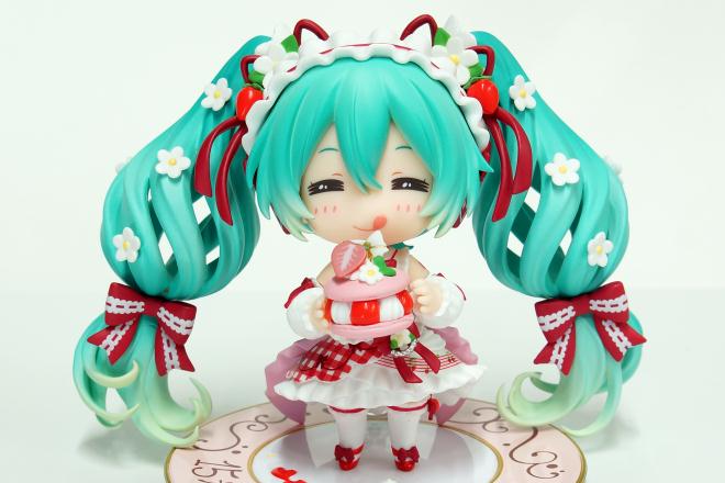 3つめのフェイスパーツは「満足顔」。開封して写真を撮っている時は「食いしん坊顔」かな?と思ったのだが、愛らしいミクちゃんに「食いしん坊」はワードセンスがなさすぎますね(笑) スイーツには小さな穴が開いており、右手の突起に合わせてしっかり固定できる。左手は添えてるだけ――さっきイチゴを持っていたハンドパーツである(イチゴが取り外し可能になっていた)。 |