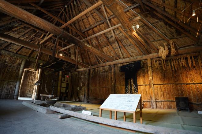 リトルワールド内では沖縄と北海道の家が並ぶという思い切った展示で、写真はそのうち北海道――アイヌの家の中。日本的ではあるがどこか少し違う雰囲気もあり、アイヌなんだなあと思わせた。詳しくないんで「この辺りが特徴です」みたいなのは分からないんだけどね! |