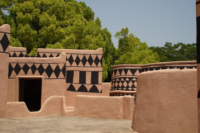 南アフリカの家。凝った幾何学模様だが、部族とか家族、役職によって「こういう形」とか決まってたりするのだろうか。マップによると「ンデベレの家」らしい……しりとりのルールを覆す「ん」から始まる単語! |