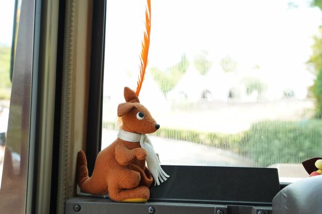 旅行は母と次姉の3人で行った。とりあえず園内のバスに乗ってヨーロッパゾーンに移動し、イタリアの建物でジェラートを食べてから一時解散、単独行動を開始した。写真はバスの前方に置いてあったカンガルーのぬいぐるみ(可愛い……が、お迎えしたいほどではない。売店で売ってるものかどうかもチェックしていない)。